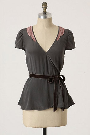 Recognize this beauty? It’s the blouse Alice wears at the beginning of Breaking Dawn, spotted courtesy of Coolspotters.The blouse is grey silk with feather epaulets and a velvet ribbon, and it retailed for $98 in 2010. Because it’s been out of stores for a while it may be difficult to find, and I’ve never seen it on eBay. Reviews on Anthropologie’s website also suggest that it runs large, so you may want to size down for this one if you’re lucky enough to find it.