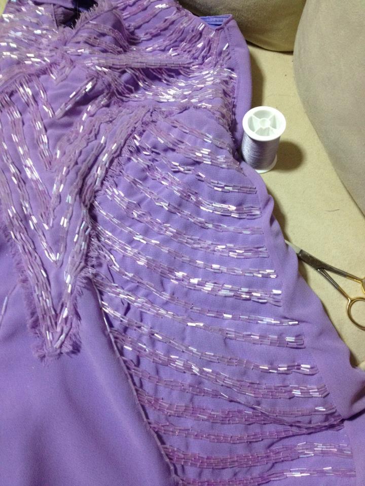 The base layer was a dark purple sparkly satin-like material from JoAnn fabrics. The overlay is purple georgette chiffon from Denver Fabrics (one of my favorite fabric shops to buy any chiffon). The denser the fabric, the easier it was to sew the beads on. The beads were purchased from Fire Mountain Gems. They are lilac bugle beads. The feathers were purchased from an Etsy seller.
