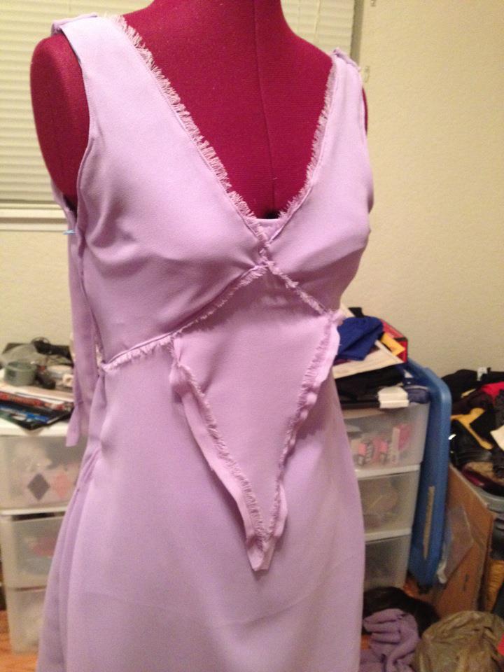 I made a base dress. Just something simple. Then I used the base as a pattern for the chiffon overlay, except using frayed pieces to make the geometric outlines like they use for the dress in the film. It was a little trial and error on that part, but I made it to where they look seamless with the chiffon, rather than sewing on top of anything.